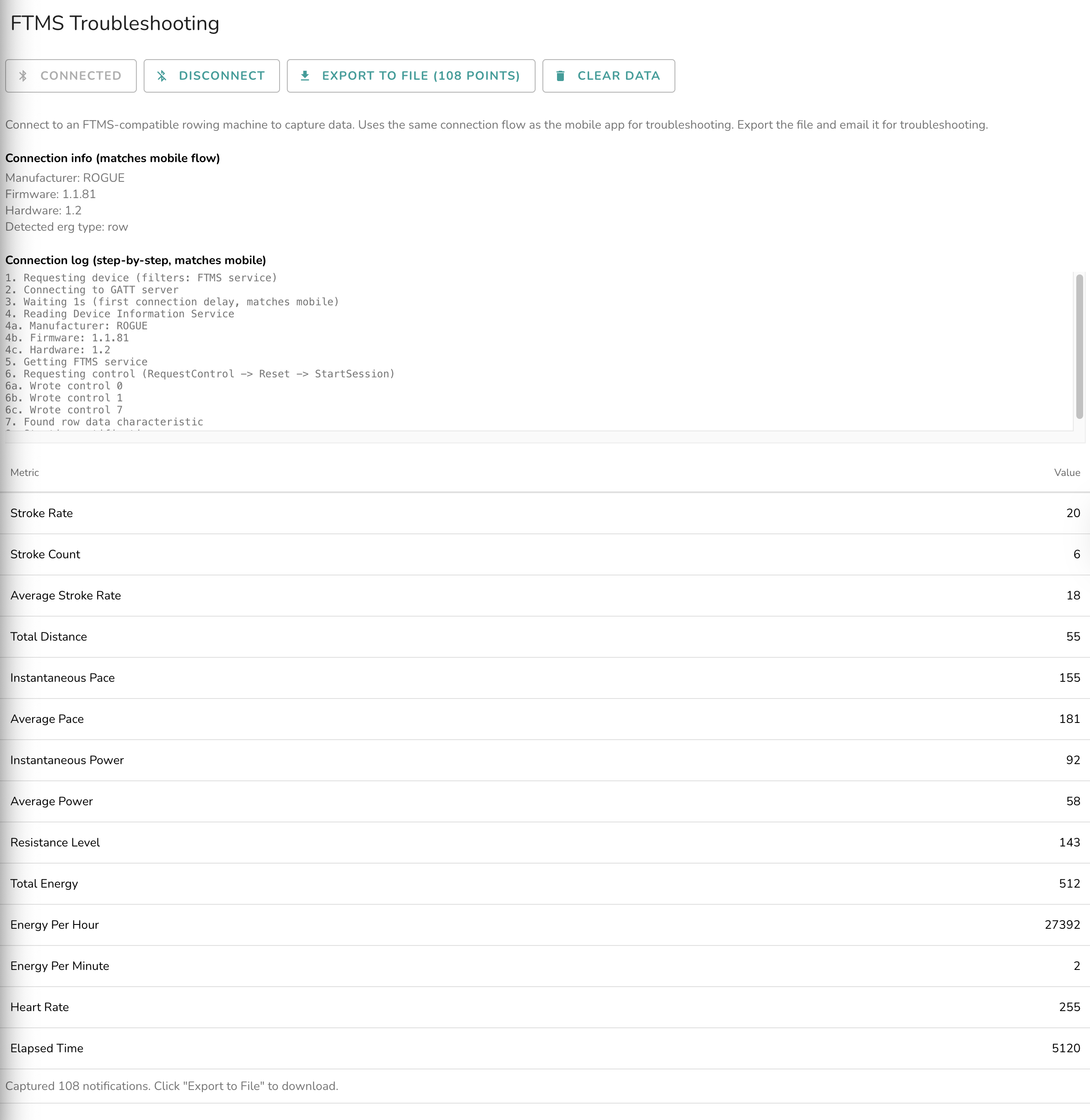 To help you visualize the process, watch this short video showing how to connect, move, and export your data using the troubleshooting tool: Troubleshooting ErgZone FTMS Connection Issues